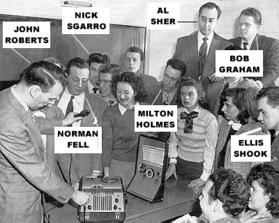From the Temple Review, Winter 1991: "A wire recorder was demonstrated in a speech class at Temple by John B. Roberts (left), now professor emeritus of communications. The apparatus was also used in radio classes to check and improve voices. Roberts, familiar to Philadelphians as a radio and TV news anchor for 25 years, founded Temple's radio station WRTI in 1948. He also served as chairman of the University's Department of Radio-Television-Film, the first program in the country to grant a degree in radio."