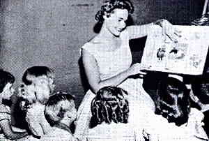 Finally the chance for an audition arrived and she was selected from among many applicants. Even on the first broadcast morning, television viewers noted no nervousness nor any mishaps in Miss Claire's performance though she had to face cameras, TV booms and hardest of all — four small children. Later Claire laughingly pointed out that her eyes roved the set constantly during the show but everything else was under control. Claire was asked whether she had ever had any technical complications that threatened to disrupt the program or her poise during the broadcast. "Well," she said, "one morning I was halfway through a program when I realized that the easel containing all the materials needed for the balance of the show had somehow failed to be put on stage with me. After many frantic cues from the director I managed to indicate with my eyes and a slight tilt of my head that I needed the easel offstage to my left. It was a tense few minutes but suddenly my message got through and the crisis was over with my audience none the wiser." Claire spends a good bit of her time in the library finding material for her show and although she spends only a half-hour on the air daily there is considerable preparation necessary. She interviews her little guests and selects those to appear with her. She also personally answers the mail from her large audience, most of it from children who follow her show daily. She has found the children most observant and considers their reactions when buying a new dress to be worn on the program. Since the children are often startlingly natural in their comments Claire has found she must be constantly alert.