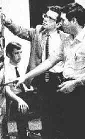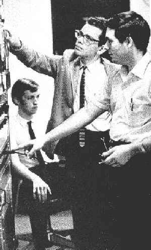 These two photographs are republished with the kind permission of The Templar, the Temple University Yearbook. The pix come from the 1969 edition. In September of 1968, after what seemed to be forever, WRTI started broadcasting out of the brand new Annenberg Hall. The executive staff that year was led by Jerry Klein. It was my (Gerry Wilkinson) pleasure to serve as his Production Director. These photos were taken in spring of 1969. They were scanned from the yearbook. Remember that the photos in the book are actually bunches of black, gray and white dots and do not reproduce as well as an actual photograph. However, by using high resolution (500 dpi), I was able to get decent reproductions and then compressed them (original photos scanned at one and megs for both) to get them to a usable size. Click on the photos to see a larger version of the picture. The second photo has three people from that year's exec. staff. From left to right, Bill Koshelnyk (Program Director), John Feldman (Technical Director) and Jerry Klein (Station Manager). This is the WRTI Web Site!