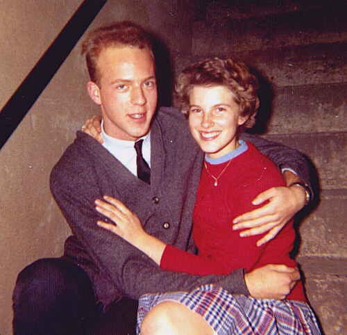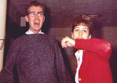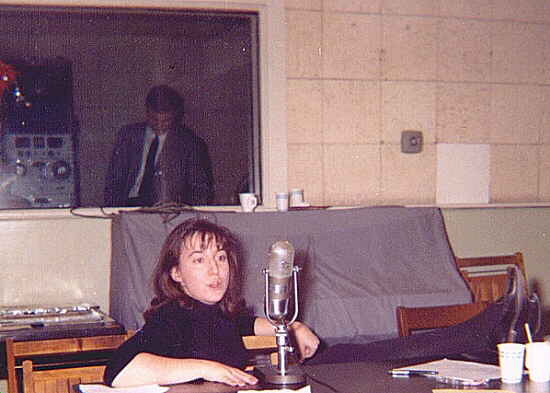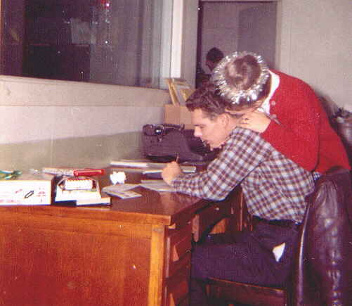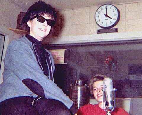 The photo is supposedly taken after one of their famous make-out sessions. Note the cementsteps and wooden railing. These are the steps that led down to the basement studios of WRTI.