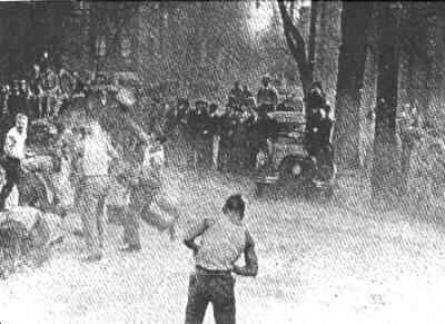 In the twenties and thirties, "Flour Fights" were waged each year between freshman and sophomore classes. On the left side of this picture, one can see ammo (sacks of flour) stacked up on the ground. This photo was taken at the corner of Watts and Norris Streets during the 1933 skirish. The picture is looking west towards Broad Street.
