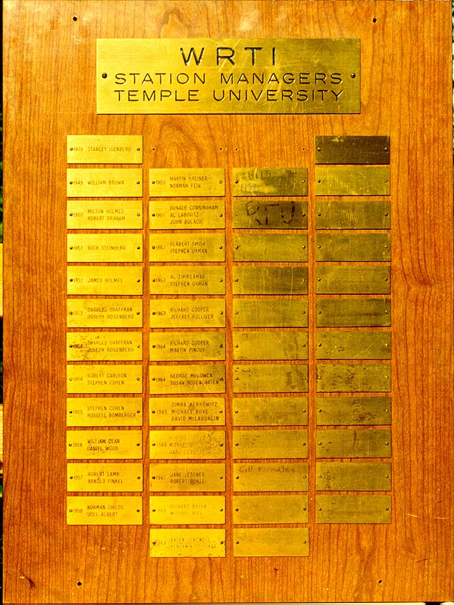 For many years, a plaque hung at WRTI, in the basement of Thomas Hall, memorializing each of the students who served as station manager over the years. As Mike Biel recalls, "It was out in the outer hallway to the right of the water cooler. If you were in the main studio hallway looking out thru the entrance, the plaque would be centered in your view on the far wall. Usually there was a desk below it."