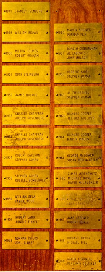 | 1954 - ROBERT CARLSON, STEPHEN COHEN | 1964 - GEORGE McGOWEN, SUSAN ROSENGARTEN | XXXX - SPACE HOLDER | XXXX - SPACE HOLDER |
