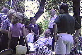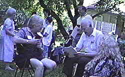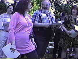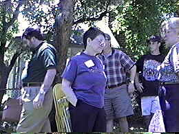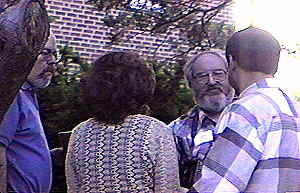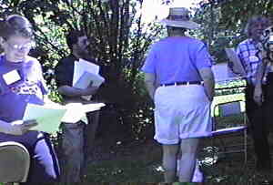 Photos are in random order just as they came off the video tape. Photo #1 - Professor Lew Klein Photo #2 - Ed Cunningham Photo #3 - Professor John Roberts talking to Sharon (Shaney) Wolov Waldman Photo #4 - Harry Wolf and Zara Wilkinson Photo #5 - Debbie & Harry Wolf and son Andy Photo #6 - Actors performing in our Playhouse 90.1 production. (Left to right) Mike Biel, Mickey Saperstone and Ed Sciaky Photo #7 - Actors and Actresses performing in our Playhouse 90.1 production. (Left to right in foreground) Walt Mocrytzki, Adrienne Zecca, Marlene Patrick and Bob Cirillo. Behind Marlene are (to the left) Ellie Menna Cunningham and (to the right) Sue Ellis. Photo #8 - Mike Biel Photo #9 - Cast of "Questing for Camelot." Includes Mike Biel, Mickey Saperstone, Jane Lessner and Harry Wolf. Photo #10 - More Playhouse 90.1 activity. (Left to right) Andy Wolf, Mike Biel, Gerry Wilkinson, Ellie Menna Cunningham and Mike Muderick Photo #11 - Jane Lessner and Mickey Saperstone looking over the Playhouse 90.1 script. Photo #12 - Playhouse 90.1 activity. (Left to right) Bob Donze, Marlene Patrick, Mike Biel and Sharon (Shaney) Wolov Waldman. Photo #13 - Bob Donze and Ellie Menna Cunningham Photo #14 - Ellie Menna Cunningham Photo #15 - (Left to right) Professor John Roberts, Sue Ellis and Adrienne Zecca Photo #16 - Ed Sciaky walks into a tree. Photo #17